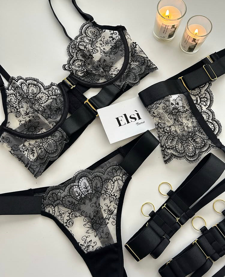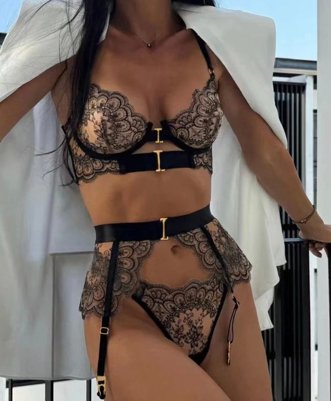 Bra+ garter belt + thong+ 2 leg rings
